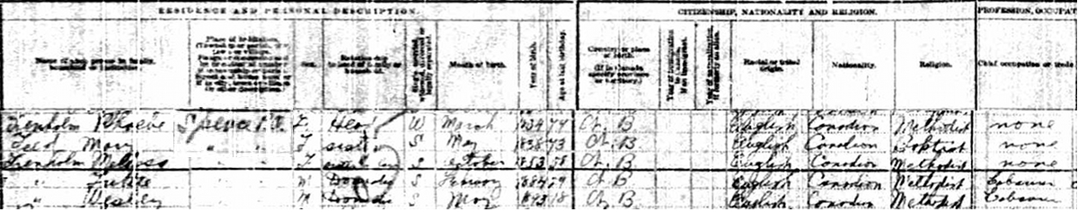 | Witness | She was enumerated on the census in 1911 in the household of John E. Estabrooks in Middle Sackville, Westmorland County, New Brunswick, CanadaG. included in the household with John (age 63) were his wife Deannah Lanchester (age 54), stepdaughter Belle Trenholm, stepsons Atwood & Earl, children by Deannah's first marriage to Matthew Albert Trenholm. There was another name, somewhat illegible, declared as a grandson, age 7, possibly a son of Belle, although there is no record of her as a mother.2 1911 Canada Census, Middle Sackville, Westmorland County, New Brunswick. Household of John E. Estabrooks, his wife Diannah (Lanchester) Trenholm, her children Belle, Atwood and Earl Trenholm by her first marriage to Matthew Albert Trenholm. The name of the child declared as a grandson is illegible. |