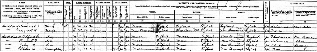 | Census | He was head of the household in the census on 4 January 1920 in Revere, Suffolk County, Massachusetts, USAG. included in the household with Frederick(age 49) were his wife Margaret Trenholm (age 49), children Alfred (age 27), Russell (age 24), John (age 21) and Helen (age 17). Fred was a mercantile salesman. Alfred was a house electrician, Russell a shoe salesman and John a grocery clerk.3 1920 US Census, Revere, Suffolk County, Massachusetts. Household of Frederick Goddard, his wife Margaret Trenholm, their children Alfred, Russell, John & Helen. |