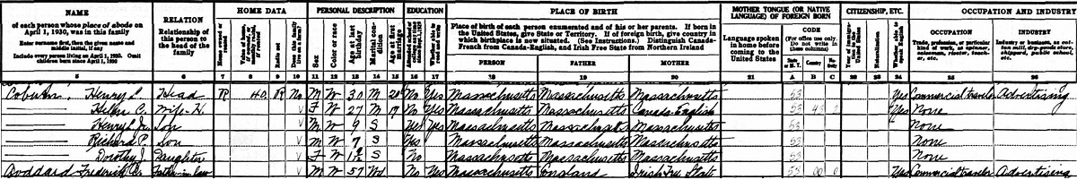 | Witness | He was enumerated on the census on 15 April 1930 in the household of Henry Lawton Coburn, Sr., in Springfield, Hampden County, Massachusetts, USAG. included in the household with Henry (age 30) were his wife Helen Goddard (age 27), their children Henry (age 9), Richard (age 7) and Dorothy (age 1 year, 9 months), and Helen's widowed father Frederick Goddard. Henry Sr. and Frederick Goddard were commerical travelers, Henry Jr. a salesman with a bread route.4 1930 US Census, Springfield, Hampden County, Massachusetts. Household of Henry Lawton Coburn, his wife Helen Goddard, their children Henry, Richard & Dorothy, and Helen's widowed father Frederick Goddard. |