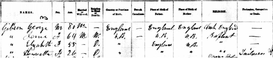 | Witness | He was enumerated on the census in 1871 in the household of George Gibson in Moncton Parish, Westmorland County, New Brunswick, CanadaG. included in the household with George (age 56) his second wife Catherine Clark (age 43), and children Isaac (age 21) & Mary (age 19) by his first wife Elizabeth Henderson, Henrietta 'Ettie' (age 20), Theora (age 16) and son James (age 19) by his second wife Catherine Clark. There was also Dora Chapman (age 16), unknown relationship, who later married a George Oulton. George was a farmer and house joiner, Isaac a farmer. The family religion was a mix of Wesleyan Methodist (George), Methodist (Isaac), and Baptist (Catherine, Mary, Henrietta, James and Theora).2 1871 Canada Census, Moncton Parish, Westmorland County, New Brunswick. Household of George Gibson, his second wife Catherine, Isaac & Mary by his first wife Elizabeth Henderson, Henrietta 'Ettie', Theora and son James by his second wife Catherine Clark. |