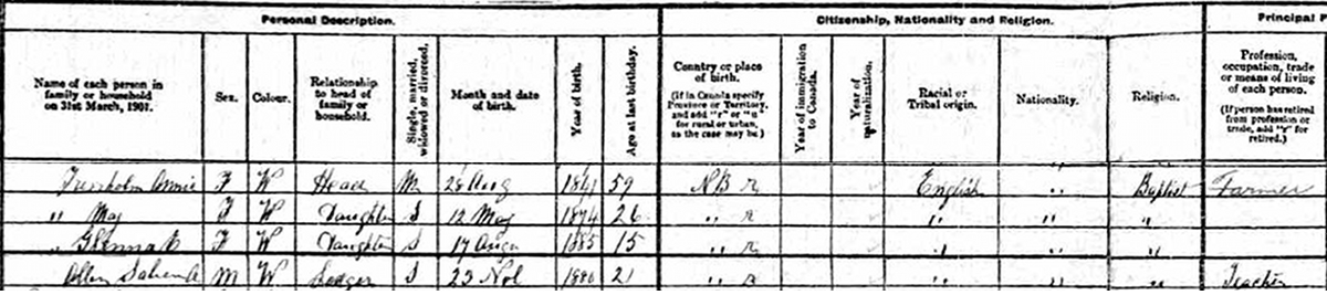 | Alt-Birth Date | An alternate recorded birth date is About 1865 in New BrunswickG.1 |