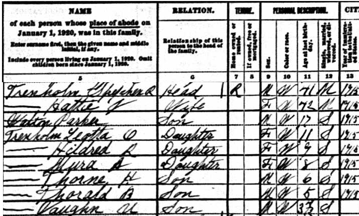 | Witness | Thorald B. Trenholm was enumerated on the census on 8 January 1920 in the household of Stephen R. Trenholm in Merrimac, Essex County, Massachusetts, USAG. included in the household with Stephen (age 41) were his wife Hattie (age 42), and children, Parker (age 17, son of Hattie by her first marriage), Leotta (age 11), Mildred (age 9), Myra (age 8), Thorne (age 6), Thorald (age 5) and Vaughn (age 3 years, 7 months).1 1920 US Census, Merrimac, Essex County, Massachusetts. Household of Stephen R. Trenholm, his wife Hattie, and children Parker Walton, Leotta, Mildred, Myra, Thorne, Thorald and Vaughn. |