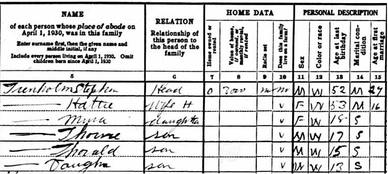 | Witness | Thorald B. Trenholm was enumerated on the census on 7 April 1930 in the household of Stephen R. Trenholm in Merrimac, Essex County, Massachusetts, USAG. included in the household with Stephen (age 52) were his wife Hattie (age 53), and children, Myra (age 18), Thorne (age 17), Thorald (age 15) and Vaughn (age 13). Stephen was a fireman with an auto body manufacturer.2 1930 US Census, Merrimac, Essex County, Massachusetts. Household of Stephen R. Trenholm, his wife Hattie, and children Myra, Thorne, Thorald and Vaughn. |