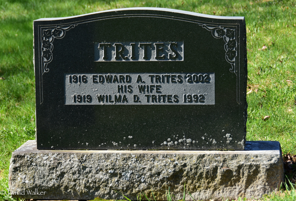 Inscription: TRITES / 1916 Edward A. Trites 2002 / His Wife / 1919 Wilma D. Trites 1992.2  Tombstone, Edward A. Trites (1916-2002), his wife Wilma D. Trites (1919-1992). Elmwood Cemetery, Moncton, Westmorland County, New Brunswick, Canada.  Flatstone for Ned.  Flatstone for Wilma.