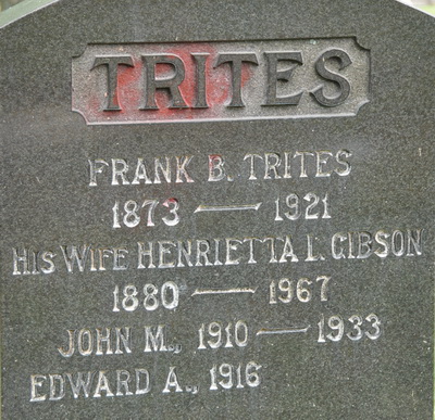 | Burial | He was buried on 13 February 1921 in Elmwood Cemetery, Moncton, Westmorland County, New Brunswick, Canada, 46.10816, -64.77601G. Inscription: GIBSON / John H. Gibson / 1835 - 1903 / His Wife Elizabeth M. Blue / 1839 - 1929 / Mary Eliza 1868 - 1886 / Laura M. 1872 - 1874 / and infants / Lenora M. 1875 - 1968. Back: TRITES / Frank B. Trites / 1873 - 1921 / His Wife Henrietta L. Gibson / 1880 - 1967 / John M. 1910 - 1933 / Edward A. 1916.3,2,4 Tombstone, John Henderson Gibson (1835-1903), his wife Elizabeth M. Blue (1839-1929), their daughters Mary Eliza (1868-1886), Laura M. (1872-1874), unnamed infants, Lenora M. (1875-1968), Henrietta L. (1880-1967), her husband Frank B. Trites (1873-1921), their sons John M. (1910-1933) and Edward A. (1916- ). Elmwood Cemetery, Moncton, Westmorland County, New Brunswick, Canada.  Back inscription detail. |