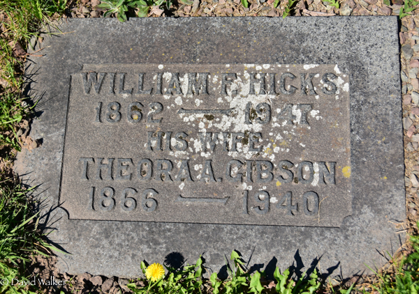 Inscription: William F. Hicks / 1862 - 1947 / His Wife / Theora A. Gibson / 1866 - 1940.1  Tombstone, William F. Hicks (1862-1947), his wife Theora A. Gibson (1866-1940). Elmwood Cemetery, Moncton, Westmorland County, New Brunswick, Canada.