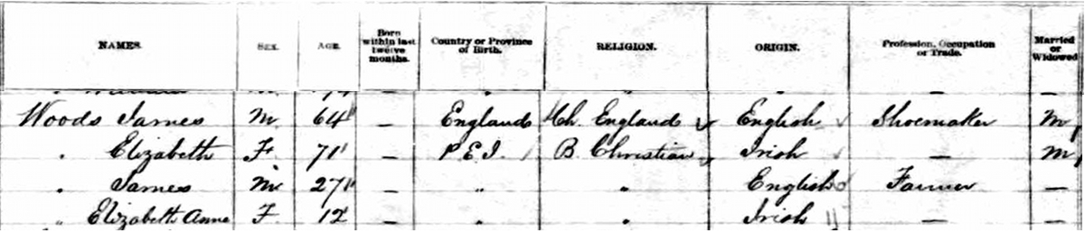 | Witness | She was enumerated on the census in 1881 in the household of James Wood, Sr., in Lot 10, Prince County, Prince Edward Island, CanadaG. included in the household with James (age 64) were his wife Elizabeth Cannon (age 71), son James (age 27) and Elizabeth Anne (age 12), possibly a granddaughter. James Sr. was a shoemaker, James Jr. a farmer. James Sr. was Anglican, the remainder of the family Bible Christian.1![]() 1881 Canada Census, Lot 10, Prince County, Prince Edward Island. Household of James, his wife Elizabeth Cannon, son James and Elizabeth Anne, possibly a granddaughter. At the age of 12 she would be too young to be a daughter of James and Elizabeth. |