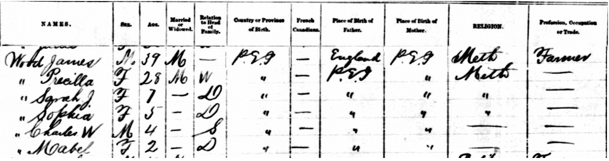 | Witness | She was enumerated on the census on 18 April 1891 in the household of James Wood, Jr., in Lot 10, Prince County, Prince Edward Island, CanadaG. included in the household with James (age 39) were his wife Priscilla (age 28), their children Sarah (age 7), Sophia (age 5), Charles (age 4) and Mabel (age 2). James was a farmer. The family religion was Methodist.1![]() 1891 Canada Census, Lot 10, Prince County, Prince Edward Island. Household of James Wood Jr., his wife Priscilla, children Sarah, Sophia, Charles and Mabel. |
