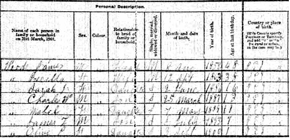 | Witness | She was enumerated on the census in 1901 in the household of James Wood, Jr., in Lot 10, Prince County, Prince Edward Island, CanadaG. included in the household with James (age 48) were his wife Priscilla (age 38), their children Sarah (age 16), Charles (age 13), Mabel (age 11), James (age 7) and Olive (age 1). James was a farmer. The family religion was Methodist.3![]() 1901 Canada Census, Lot 10, Prince County, Prince Edward Island. Household of James Wood Jr., his wife Priscilla, children Sarah, Charles, Mabel, James and Olive. |