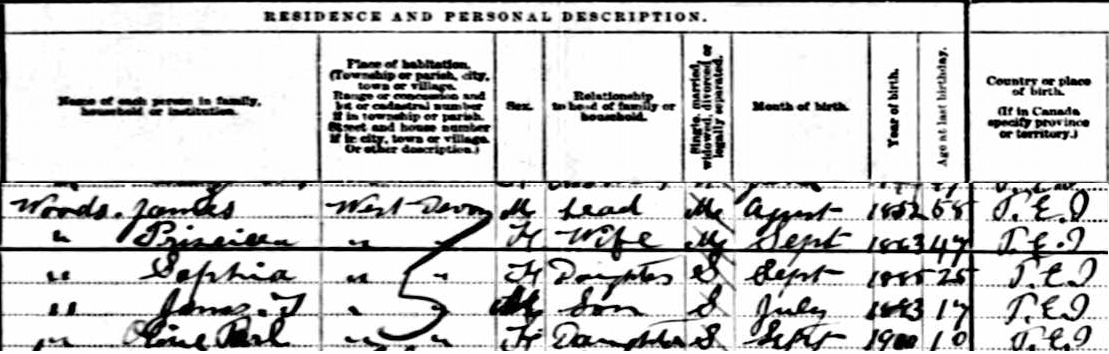| Witness | He was enumerated on the census in 1901 in the household of James Wood, Jr., in Lot 10, Prince County, Prince Edward Island, CanadaG. included in the household with James (age 48) were his wife Priscilla (age 38), their children Sarah (age 16), Charles (age 13), Mabel (age 11), James (age 7) and Olive (age 1). James was a farmer. The family religion was Methodist.2![]() 1901 Canada Census, Lot 10, Prince County, Prince Edward Island. Household of James Wood Jr., his wife Priscilla, children Sarah, Charles, Mabel, James and Olive. |