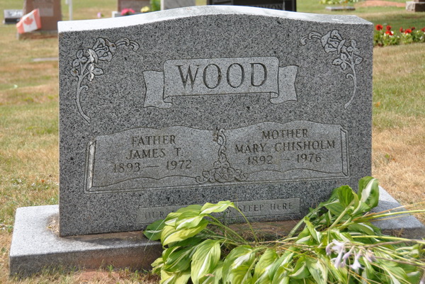 | Burial | He was buried in the United Church Cemetery, West Devon, Prince County, Prince Edward Island, Canada, 46.67330, -64.11568G. Inscription: WOOD / Father / James T. / 1893 - 1972| Mother / Mary Chisholm / 1892 - 1976.6![]() Tombstone, James Theodore Wood (1893-1972), his wife Mary Chisholm (1892-1976). United Church Cemetery, West Devon, Prince County, Prince Edward Island. |