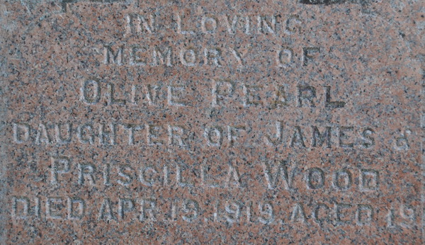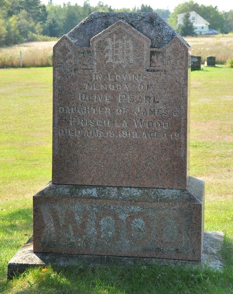 | Burial | She was buried in the United Church Cemetery, West Devon, Prince County, Prince Edward Island, Canada, 46.67327, -64.11565G. Inscription: In loving / memory of / Olive Pearl / Daughter of James & / Priscilla Wood / Died Apr. 19, 1919, Aged 19 / WOOD.5![]() Tombstone, Olive Pearl Wood (1899-1919). United Church Cemetery, West Devon, Prince County, Prince Edward Island. ![]() Inscription detail. |
