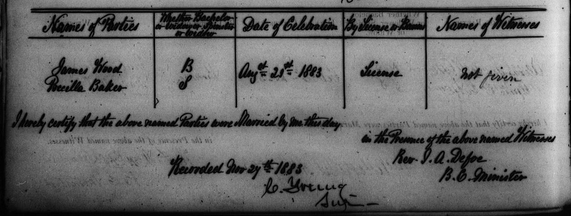 | Marriage | She married James Wood, Jr., son of James Wood, Sr., and Elizabeth Cannon, on 21 August 1883, in Prince County, Prince Edward Island, CanadaG. James Wood (B), Priscilla Baker (S), Married 21 August 1883, by Rev. J. A. Defoe. Witnesses "not given".4,1,2![]() Marriage Registration. James Wood Jr. and Priscilla Baker, 21 August, 1883. Image on-line from www.familysearch.org. |