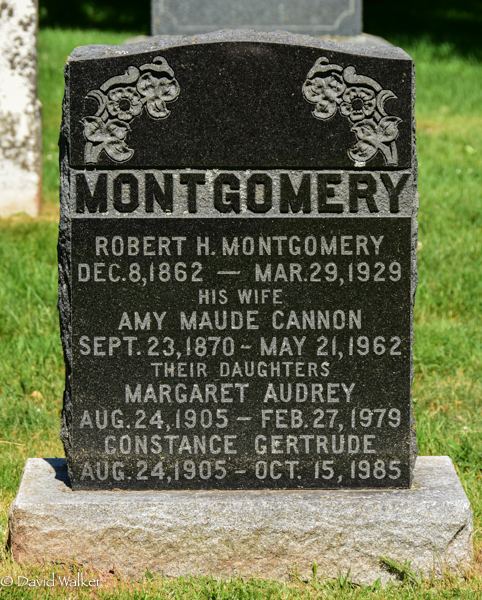 | Burial | He was buried in the Peoples Cemetery, Summerside, Prince County, Prince Edward Island, Canada, 46.40549, -63.77711G. Inscription: MONTGOMERY / Robert H. Montgomery / Dec. 8, 1862 - Mar. 29, 1929 / His Wife / Amy Maude Cannon / Sept. 23, 1870 - May 21, 1962 / Their daughters / Margaret Audrey / Aug. 24, 1905 - Feb. 27, 1979 / Constance Gertrude / Aug. 24, 1905 - Oct. 15, 1985 Back: MONTGOMERY.4 ![]() Tombstone for Robert Montgomery (1862-1929), his wife Amy Maude Cannon (1870-1962), their daughters Margaret Audrey (1905-1979) and Constance Gertrude (1905-1985). Peoples Cemetery, Summerside, Prince County, Prince Edward Island, Canada. |