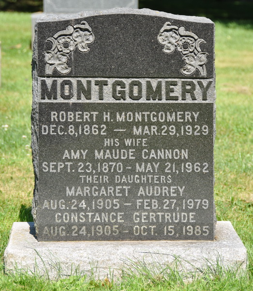 | Burial | She was buried in the Peoples Cemetery, Summerside, Prince County, Prince Edward Island, Canada, 46.40549, -63.77711G. Inscription: MONTGOMERY / Robert H. Montgomery / Dec. 8, 1862 - Mar. 29, 1929 / His Wife / Amy Maude Cannon / Sept. 23, 1870 - May 21, 1962 / Their daughters / Margaret Audrey / Aug. 24, 1905 - Feb. 27, 1979 / Constance Gertrude / Aug. 24, 1905 - Oct. 15, 1985 Back: MONTGOMERY.1 ![]() Tombstone for Robert Montgomery (1862-1929), his wife Amy Maude Cannon (1870-1962), their daughters Margaret Audrey (1905-1979) and Constance Gertrude (1905-1985). Peoples Cemetery, Summerside, Prince County, Prince Edward Island, Canada. |
