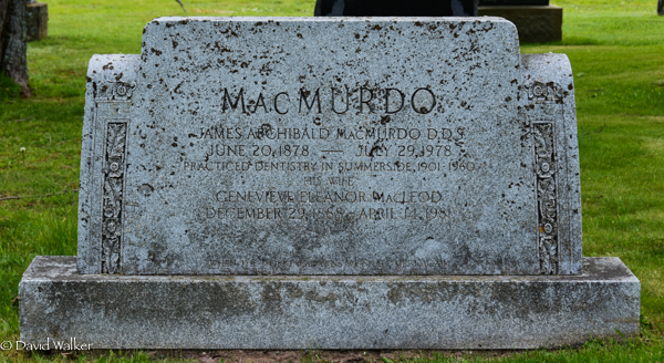 Inscription: MacMURDO / James Archibald MacMurdo / June 20, 1878 - July 29, 1978 / Practiced Dentistry in Summerside, 1901 - 1960 / His Wife / Genevieve Eleanor MacLeod / December 29, 1888 - April 14, 1981.3,5  Cemetery marker, James Archibald MacMurdo (1878-1978), his wife Genevieve Eleanor MacLeod (1888-1981). Peoples Cemetery, Summerside, Prince County, Prince Edward Island, Canada.