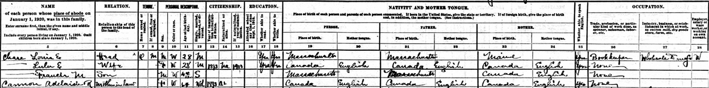 | Witness | Lulu E. Cannon was enumerated on the census on 19 January 1920 in the household of Lewis Rae Chase in Holbrook, Norfolk County, Massachusetts, USAG. included in the household with Louis/Lewis (age 28) were his wife Lulu Cannon (age 28), their son Francis (age 4 years, 4 months), and Lulu's mother Adelaide (Williams) Cannon (age 64). Louis was a book keeper.7 1920 US Census, Holbrook, Norfolk County, Massachusetts. Household of Louis/Lewis Chase, his wife Lulu Cannon, their son Francis, and Lulu's mother Adelaide (Williams) Cannon. |
