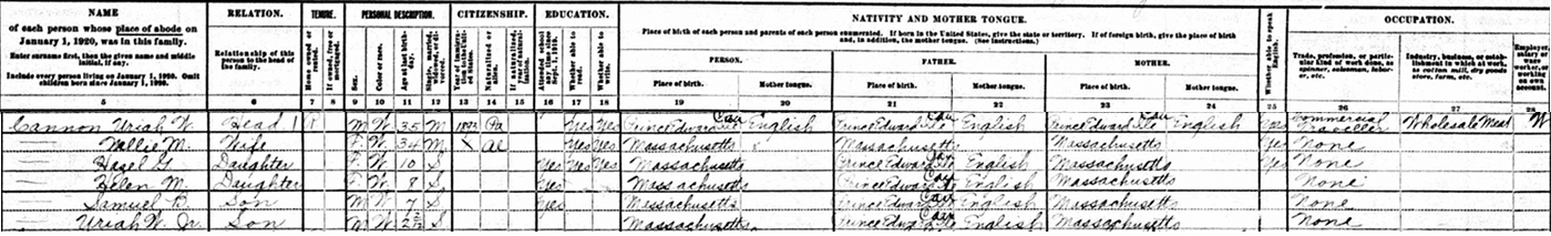 | Census | Uriah William Cannon was head of the household in the census on 3 January 1920 in Brockton, Plymouth County, Massachusetts, USAG. included in the household with Uriah (age 35) were his wife Nellie Bernard (age 34), children Hazel (age 10), Helen (age 8), Samuel (age 7) and Uriah Jr. (age 2 years & 2 months). Uriah was a commercial traveller for a wholesale meat company. Hazel, Helen and Samuel were in school.7 1920 US Census, Brockton, Plymouth County, Massachusetts. Household of Uriah Cannon, his wife Nellie Bernard, children Hazel, Helen, Samuel and Uriah Jr. |