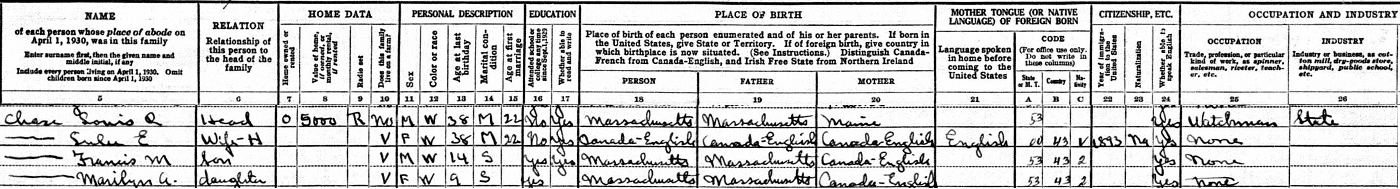 | Witness | She was enumerated on the census on 4 April 1930 in the household of Lewis Rae Chase in Holbrook, Norfolk County, Massachusetts, USAG. included in the household with Louis/Lewis (age 38) were his wife Lulu Cannon (age 38), son Francis (age 14) and daughter Marilyn (age 9). Louis was a watchman for the state of Massachusetts.2 1930 US Census, Holbrook, Norfolk County, Massachusetts. Household of Louis/Lewis Chase, his wife Lulu Cannon, their son Francis, and daughter Marilyn. |