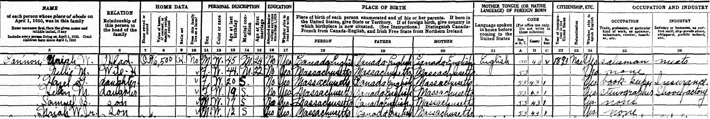 | Census | He was head of the household in the census on 8 April 1930 in Brockton, Plymouth County, Massachusetts, USAG. included in the household with Uriah (age 45) were his wife Nellie Bernard (age 44), children Hazel (age 20), Helen (age 19), Samuel (age 17) and Uriah Jr. (age 12). Uriah was a meat salesman, Hazel a book keeper for an insurance company, and Helen a stenographer for a shoe factory.8 1930 US Census, Brockton, Plymouth County, Massachusetts. Household of Uriah Cannon, his wife Nellie Bernard, children Hazel, Helen, Samuel and Uriah Jr. |
