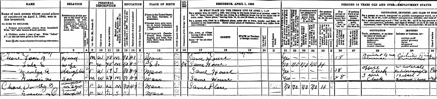 | Census | He was head of the household in the census on 18 April 1940 in 28 Adams St., Holbrook, Norfolk County, Massachusetts, USA, 42.15041, -71.00955G. included in the household with Louis/Lewis (age 48) were his wife Lulu Cannon (age 48), daughter Marilyn (age 19), son Francis (age 24), his wife Dorothy (age 22), their son Francis (age 1 month). Louis was a "forest fire observer, for County Fire Prevention", Marilyn was a clerk for a wholesale publishing company, and Francis was a clerk in a retail grocery store.4 1940 US Census, Holbrook, Norfolk County, Massachusetts. Household of Louis/Lewis Chase, his wife Lulu Cannon, their daughter Marilyn, their son Francis, his wife Dorothy, their son Francis. |