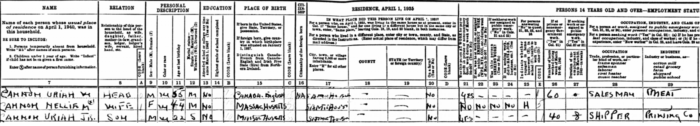 | Census | He was head of the household in the census in April 1940 in 38 Camden Ave., Brockton, Plymouth County, Massachusetts, USAG. included in the household with Uriah (age 55) were his wife Nellie Bernard (age 44-sic), their son Uriah Jr. (age 22). Uriah Sr. was a meat salesman, Uriah Jr. was a shipper for a printing company. [Nellie's age was incorrectly recorded here as 44, but her actual age would have been 54.].9 1930 US Census, Brockton, Plymouth County, Massachusetts. Household of Uriah Cannon, his wife Nellie Bernard, their son Uriah Jr. |