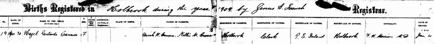 - [S7467] Massachusetts Town Records, 1620-1988, Hazel Gertrude Cannon, digital copy of Birth Registration book for Holbrook, ((filed 10 January 1910)), Ancestry (Canada), http://www.ancestry.ca.