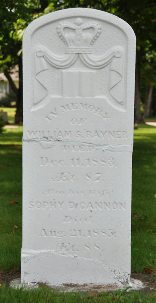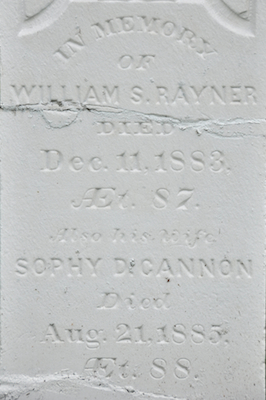 | Burial | He was buried in St. John's Anglican Church Cemetery, St. Eleanors, Prince County, Prince Edward Island, Canada, 46.42001, -63.81057G. In memory / of / William S. Rayner / Died / Dec. 11, 1883 / Aged 87. / Also His Wife / Sophy D. Cannon / Died / Aug. 21, 1885, / AEt. 88.1,5 Tombstone, William S. Rayner (1796-1883), his wife Sophy D. Cannon (1797-1885). St. John's Anglican Cemetery, St. Eleanors, Prince County, Prince Edward Island, Canada.  Inscription detail. |