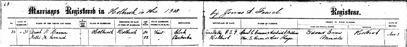 | Marriage | Uriah William Cannon married Nellie M. Bernard daughter of William E. Bernard and Rose Thayer, on 31 October 1908, in Holbrook, Norfolk County, Massachusetts, USAG. both were living in Holbrook when married. Uriah was a clerk, Nellie a shoemaker.4 Marriage Record, Uriah William Cannon and Nellie M. Bernard, 31 October 1908, from Massachusetts Vital and Town Records. |