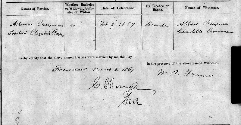 | Marriage | She married Artemas Crossman on 2 February 1867, in Prince County, Prince Edward IslandG. Sophia Elizabeth Rayner, Artemas Crossman (W), Married 2 February, 1867 by license, by W. R. Frame. Witnesses Albert Rayner, Charlotte Crossman. Recorded 30 March 1867, C. Irving surrogate.3 Marriage Registration. Artemas Crossman and Sophia Elizabeth Rayner, 2 February, 1867. Image on-line from www.familysearch.org. |