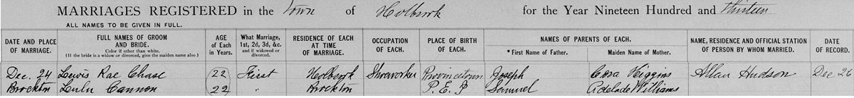 | Marriage | She married Lewis Rae Chase son of Joseph Chase and Cora Higgins, on 24 December 1913, in Brockton, Plymouth County, Massachusetts, USAG.4 Marriage Registration, Lewis Rae Chase & Lulu Cannon. |