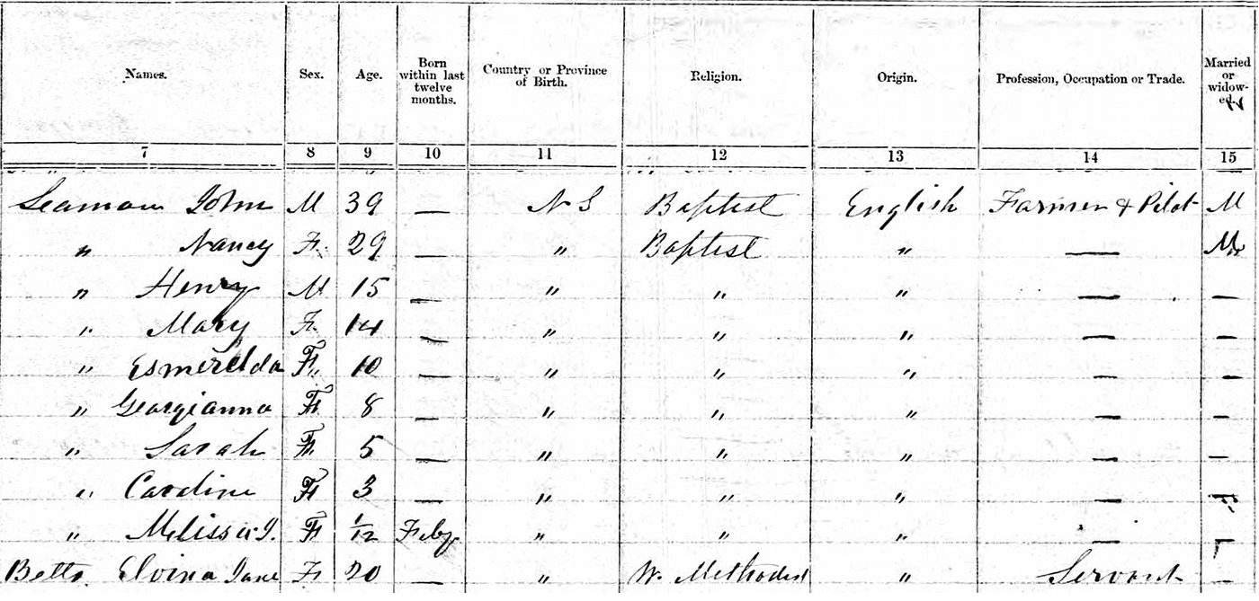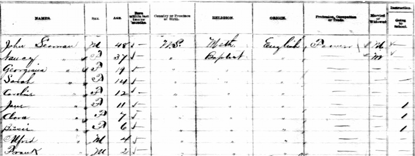 | Census | John J. Seaman was head of the household in the census in March 1871 in Pugwash, Cumberland County, Nova Scotia, CanadaG. included in the household with John (age 39) were his wife Nancy (age 29), their children Henry (age 15), Mary (age 14), Esmerelda (age 10), Georgianna (age 8), Sarah (age 5), Caroline (age 3) & Mellissa (age 1 month). There was also Elvina Jane Betts (age 20), a servant. John was a farmer and pilot, like his father. Mary, Esmerelda and Georgianna were in school. The family religion was Baptist. They lived in the adjacent household to John's parents, James & Mary Seaman.6 1871 Canada Census, Pugwash, Cumberland County, Nova Scotia. Household of John Seaman, his wife Nancy Evans, their children Henry, Mary, Esmerelda, Georgianna, Sarah, Caroline and Mellissa, and a servant. |