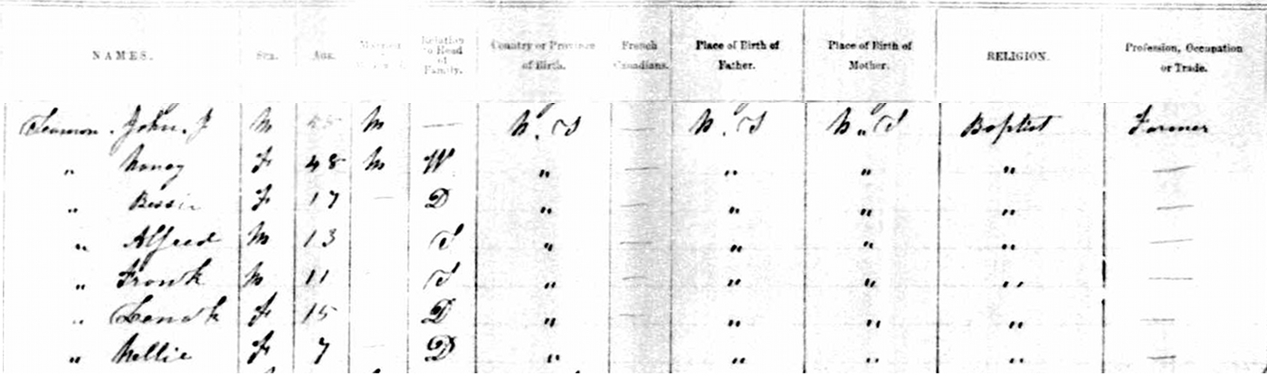| Census | He was head of the household in the census in 1881 in Pugwash, Cumberland County, Nova Scotia, CanadaG. included in the household with John (age 48), were his wife Nancy Evans (age 37), their children Georgianna (age 19), Sarah (age 14), Caroline (age 12), JAne (age 11), Clara (age 7), Bessie (age 6), Alfred (age 4) and Frank (age 2). John was a farmer. Only Jane, Clara and Bessie were in school. John was Methodist, the rest of the family was Baptist. They lived in the household adjacent to John's parents, James & Mary Seaman.7 1901 Canada Census, Pugwash, Cumberland County, Nova Scotia. Household of John J. Seaman, his wife Nancy Evans, their children Georgianna, Sarah, Caroline, Jane, Clara, Bessie, Alfred and Frank. |