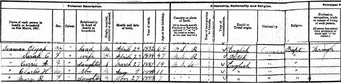- [S7547] 1901 Canada Census, Pugwash, Cumberland County, Nova Scotia, household #1, of John J. Seaman, From 008 to 9 April 1901, digital image of census page, Polling District #11, Page 1. Library & Archives Canada. Library & Archives Canada, Library & Archives Canada; 395 Wellington St., Ottawa,, Ontario, Canada.