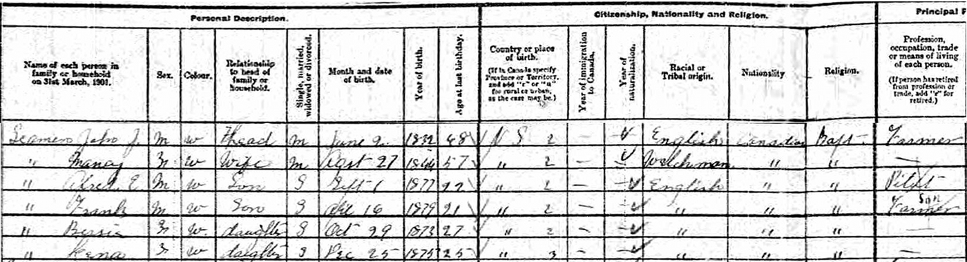 | Son | Frank Seaman was enumerated on the census on 8 April 1901 in the household of John J. Seaman, as a son, in Pugwash, Cumberland County, Nova Scotia, CanadaG. included in the household with John (age 68), were his wife Nancy Evans (age 57), their children Alfred (age 22), Frank (age 21), Bessie (age 27) and Lena (age 25). John was a farmer, Alfred a pilot and Frank a farmer's son. The family religion was Baptist. They lived in the property close by John's brother Andrew, previously occupied by their parents, James & Mary.1 1901 Canada Census, Pugwash, Cumberland County, Nova Scotia. Household of John J. Seaman, his wife Nancy Evans, their children Alfred, Frank, Bessie and Lena. |