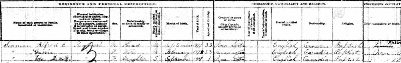 | Census | Capt. Alfred Edward Seaman was head of the household in the census in 1911 in Pugwash, Cumberland County, Nova Scotia, CanadaG. included in the household with Alfred (age 33) were his wife Gussie DeWolfe (age 33), their daughter Ida (age 1). Alfred's occupation was a sea pilot. The family religion was Baptist. Their household was adjacent to that of Gussie's parents, Charles & Ida DeWolfe.3 1911 Canada Census, Pugwash, Cumberland County, Nova Scotia. Household of Alfred E. Seaman, his wife Gussie DeWolfe, and their daughter Ida. |