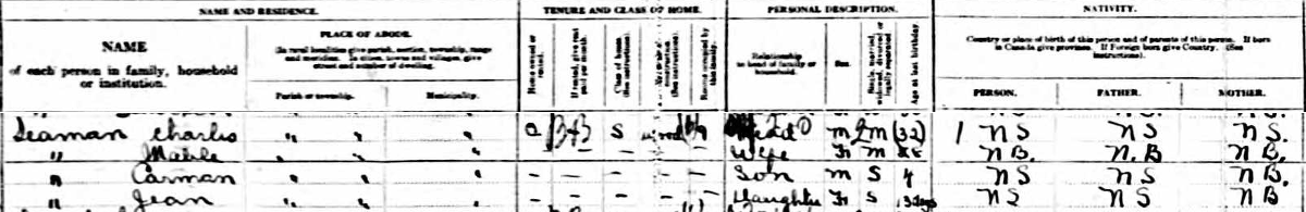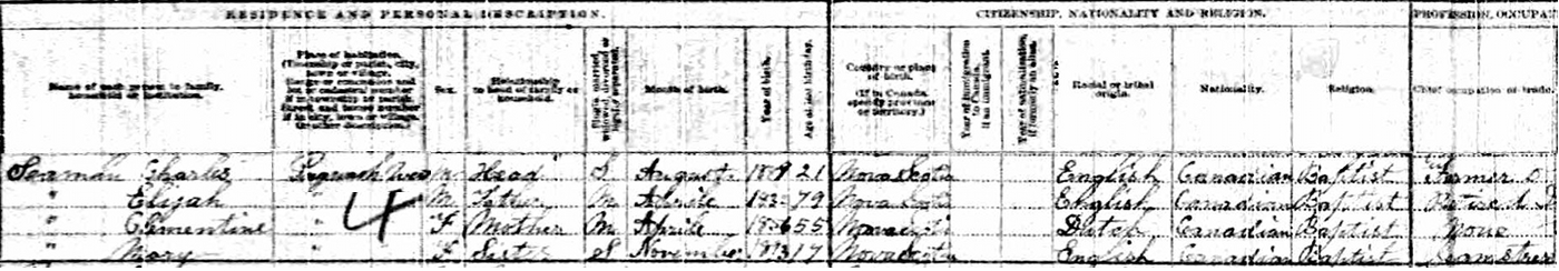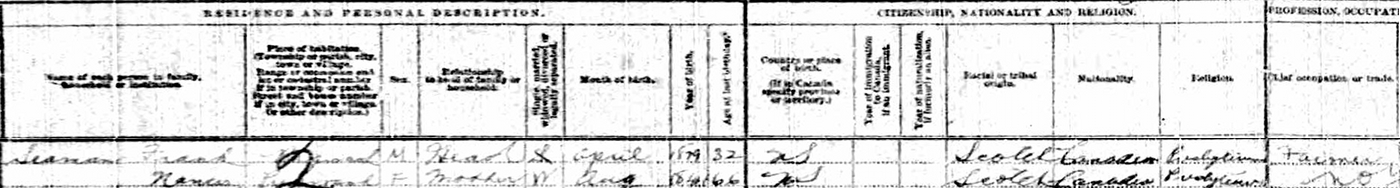| Census | Frank Seaman was head of the household in the census on 10 June 1911 in Pugwash, Cumberland County, Nova Scotia, CanadaG. included in the household with Frank (age 32) was his widowed mother, Nancy Evans (age 66). Frank was single and a farmer. They were both Presbyterian.4 1911 Canada Census, Pugwash, Cumberland County, Nova Scotia. Household of Frank Seaman and his widowed mother Nancy Evans. |