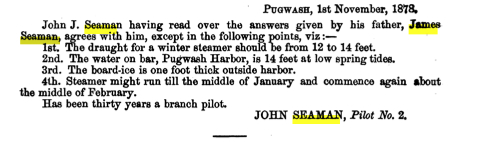 | Occupation | He was a branch pilot Between 1848 and 1878 in Pugwash, Cumberland County, Nova ScotiaG.3 Interview with John J. Seaman, Report Relative to Steam Communication Between Prince Edward Island and the Main Land, published by the House of Commons Select Committee, 1888. Original digital copy courtesy of Google Books.