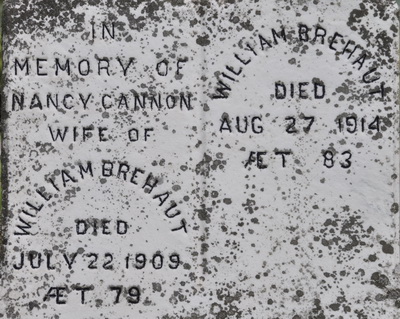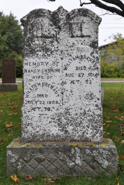 | Burial | He was buried in the Peoples Cemetery, Summerside, Prince County, Prince Edward Island, Canada, 46.40511, -63.77714G. Inscription: In / Memory of / Nancy Cannon / Wife of / William Brehaut / Died July 22, 1909 / ÆT. 79 | William Brehaut / Died / Aug. 27, 1914 / ÆT. 83.1 Tombstone, Nancy Cannon (1831-1909), her husband William Brehaut (1831-1914). Peoples Cemetery, Summerside, Prince County, Prince Edward Island, Canada.  Front inscription detail. |
