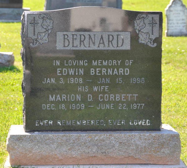 Inscription: BERNARD / In Loving Memory of / Edwin Bernard / Jan. 3, 1908 - Jan. 15, 1998 / His Wife / Marion D. Corbett / Dec. 18, 1909 - June 22, 1977 / Ever Remembered Ever Loved.2,3  Tombstone, Edwin Bernard (1908-1998), his wife Marion D. Corbett (1909-1977). Geddie Memorial Cemetery, Springbrook, Queens County, Prince Edward Island, Canada.