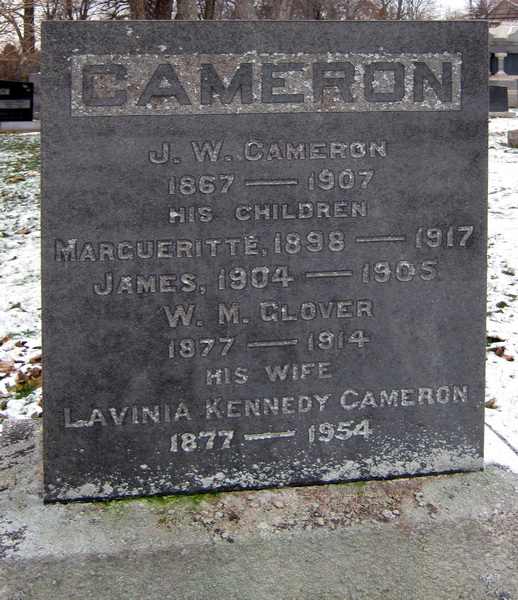 Stone #419.Inscription: CAMERON / J. W. Cameron / 1867 - 1907 / His Children / Margueritte, 1898 - 1917 / James, 1904 - 1905 / W. M. Glover / 1877 - 1914 / His Wife / Lavinia Kennedy Cameron / 1877 - 1954.9  Tombstone, J. W. Cameron (1867-1907), his children Margueritte (1898-1917) and James (1904-1905), his wife Lavinia Kennedy (1877-1954), her second husband William Marchbank Glover (1877-1914). Peoples Cemetery, Charlottetown, Queens County, Prince Edward Island, Canada. Photo courtesy of Megan Glover.