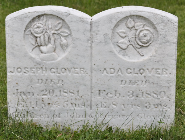 Inscription: Joseph Glover / Died / Jan. 20, 1881, / Æ. 14 yrs. 5 ms. | Ada Glover / Died / Feb. 3, 1880 / Æ. 8 yrs. 3 ms. // Children of John & Margaret Glover.1,2  Tombstone, Joseph Glover (1866-1881), his sister Ada Glover (1871-1880). Presbyterian/United Cemetery, North Bedeque, Prince County, Prince Edward Island, Canada.
