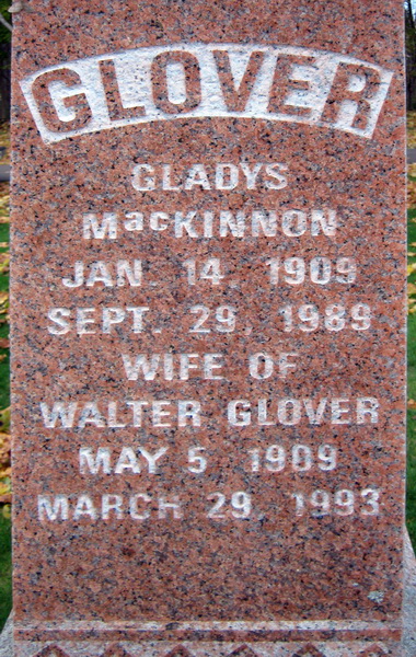 Inscription: GLOVER / Gladys / MacKinnon / Jan. 14, 1909 / Sept. 29, 1989 / Wife of / Walter Glover / May 5, 1909 / March 29, 1993.1  Tombstone, Walter Glover (1909-1993), his wife Gladys MacKinnon (1909-1989). Sherwood Cemetery, Charlottetown, Queens County, Prince Edward Island, Canada. Photo courtesy of Megan Glover.