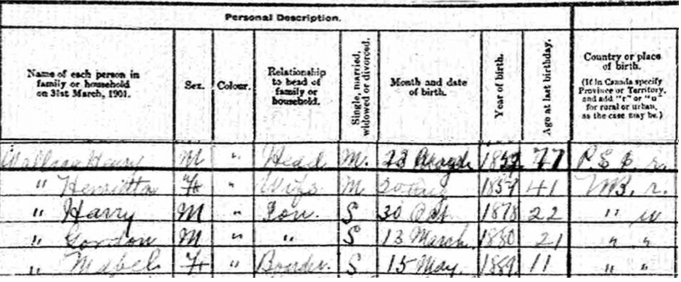 | Witness | She was enumerated on the census on 23 April 1901 in the household of Henry Wallace in Moncton, Westmorland County, New Brunswick, CanadaG. included in the household with Henry (age 77) were his wife Henrietta (age 62), sons Harry (age 22) & Gordon (age 21), and Mabel Wallace (age 11), listed as a boarder. Henry's occupation was Section Man with the railway (I.C.R.). The family religion was Baptist.1 1901 Canada Census, Moncton, Westmorland County, New Brunswick. Household of Henry Wallace, his wife Henrietta, sons Harry & Gordon, and Mabel Wallace, recorded as a boarder (identity unknown). |