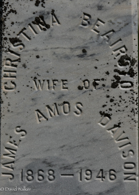 Inscription: In / Memory of / Mary Jane Blaney / Wife of / Andrew Davison / Born / Jan. 2, 1828, / Died / Jan. 17, 1909 / DAVISONLeft: Andrew Davison / Died / Mar. 29, 1915, / ÆT. 82.Right: In Loving / Memory of / James Amos Davison / Born / Nov. 15, 1863, / Died Dec. 26, 1942Back: Christina Beairsto / Wife of / James Amos Davison / 1868 - 1946.3  Marker, Andrew Davison (1832-1915), his wife Mary Jane Blaney (1828-1909), their son James Amos Davison (1863-1942), his wife Christina Beairsto (1868-1946). Geddie Memorial Cemetery, Springbrook, Queens County, Prince Edward Island, Canada.  Front inscription detail.  Left inscription detail.  Right inscription detail.  Back inscription detail.