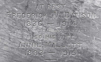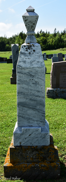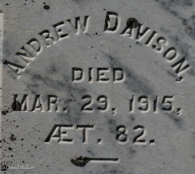 - [S13438] Cemetery marker, Geddie Memorial Cemetery, Springbrook, Queens County, Prince Edward Island, Canada. Andrew Davison family plot, tombstone inscription & photograph; documented by David A. Walker, 8 August 2018.