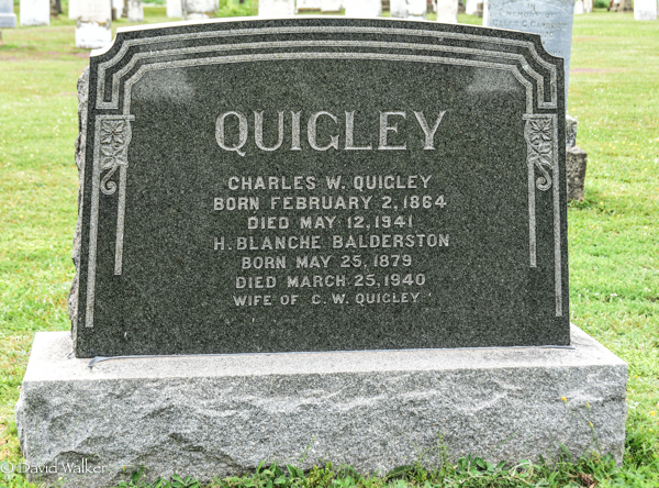 Inscription: QUIGLEY / Charles W. Quigley / Born February 2, 1864 / Died May 12, 1941 / H. Blanche Balderston / Born May 25, 1879 / Died March 25, 1940 / Wife of C. W. Quigley.1,4  Tombstone, Charles William Quigley (1892-1980), his wife Christina MacKay (1890-1972). Presbyterian/United Cemetery, Midgell, Kings County, Prince Edward Island, Canada.