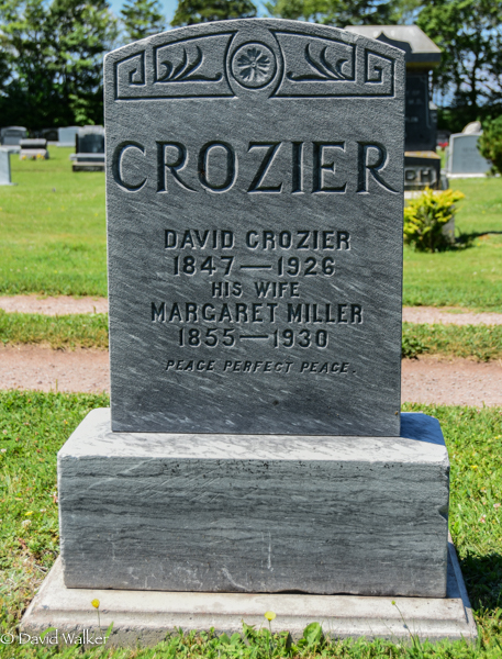 | Principal 2 | She witnessed the burial of David Crozier and Margaret Miller in the Peoples Cemetery, Kensington, Prince County, Prince Edward Island, Canada, 46.44807, -63.62879G.2,4 Marker - David Crozier  Back inscription detail. |