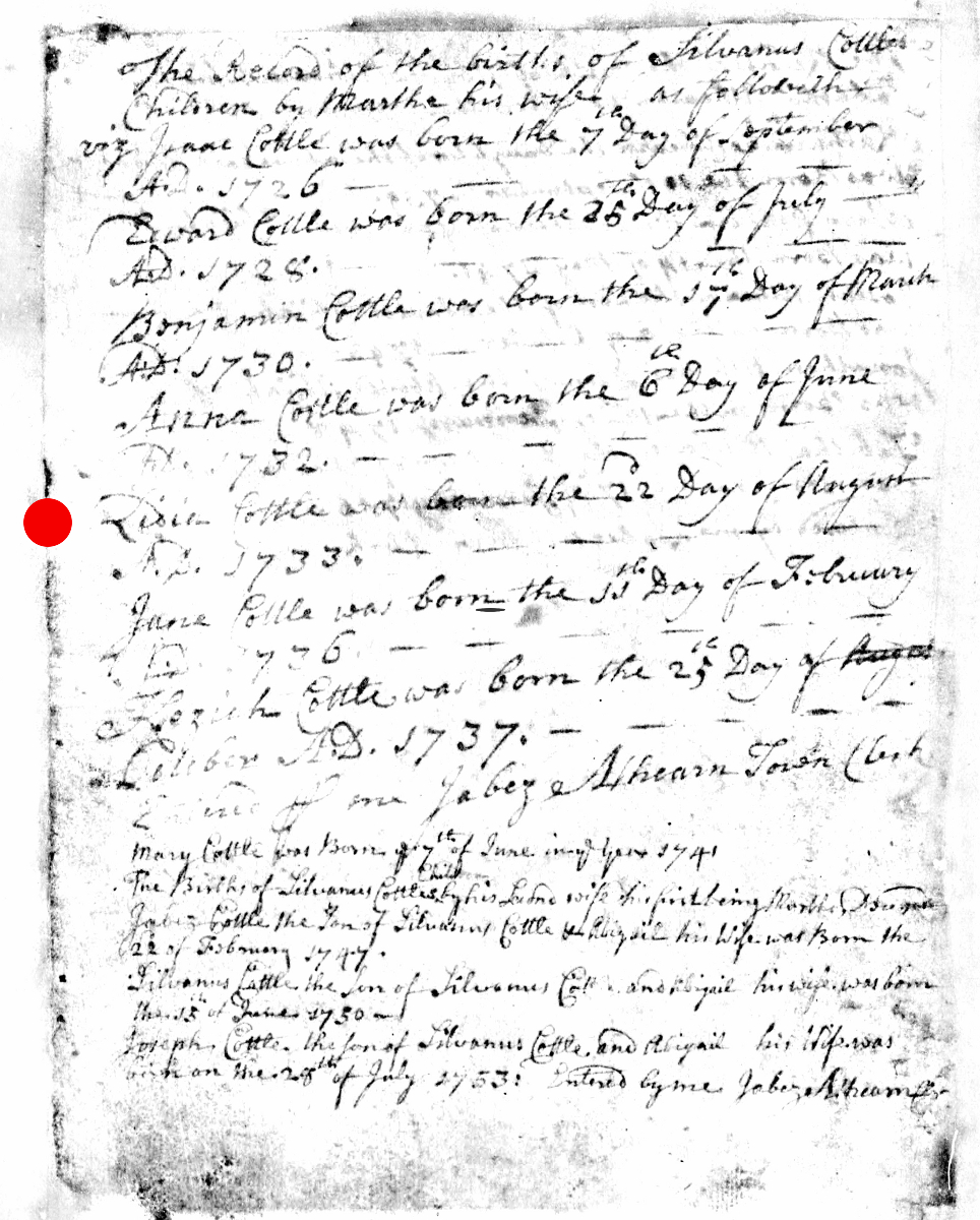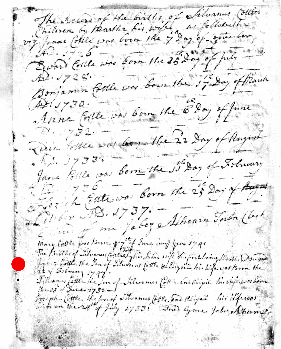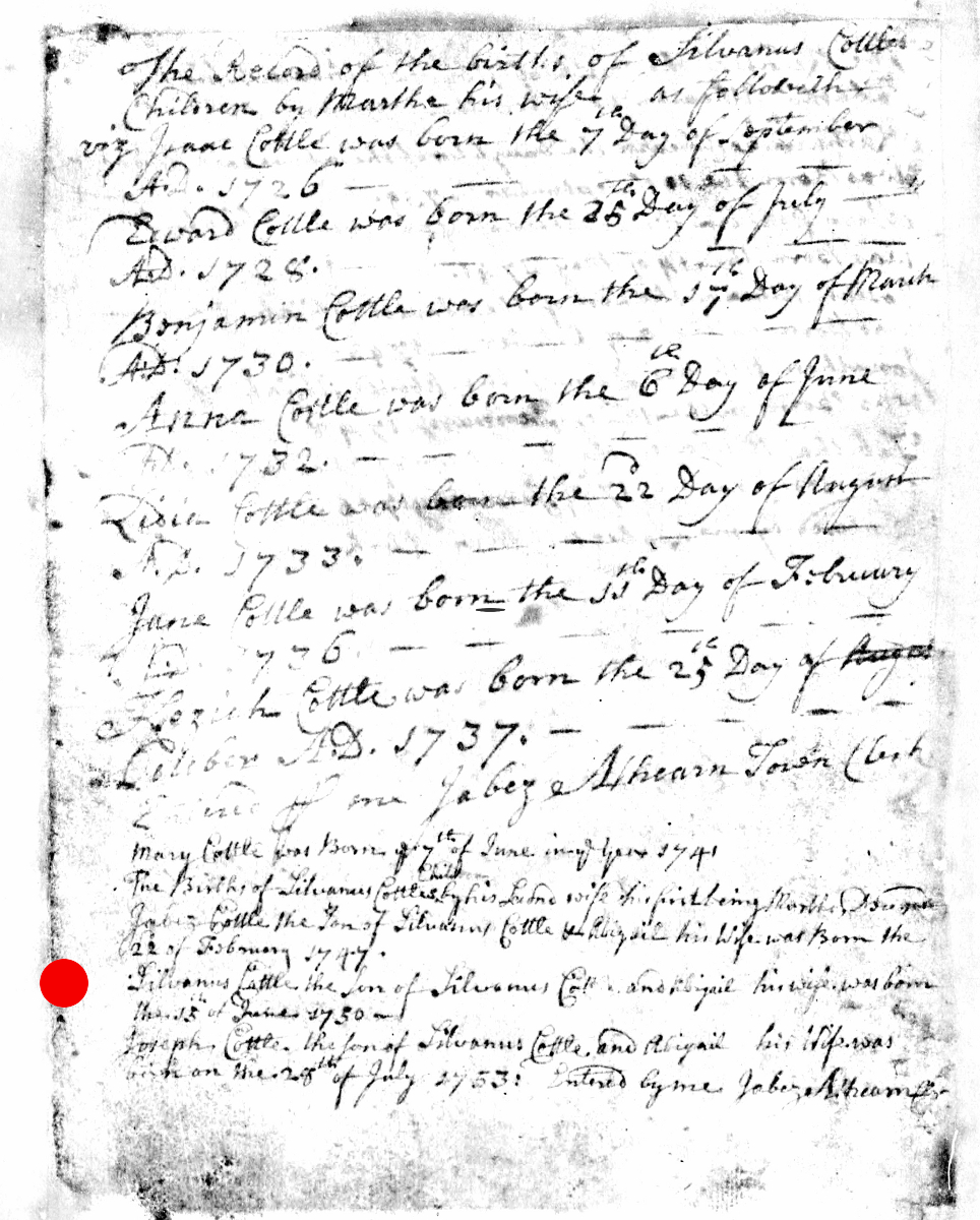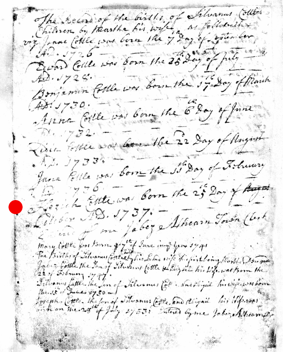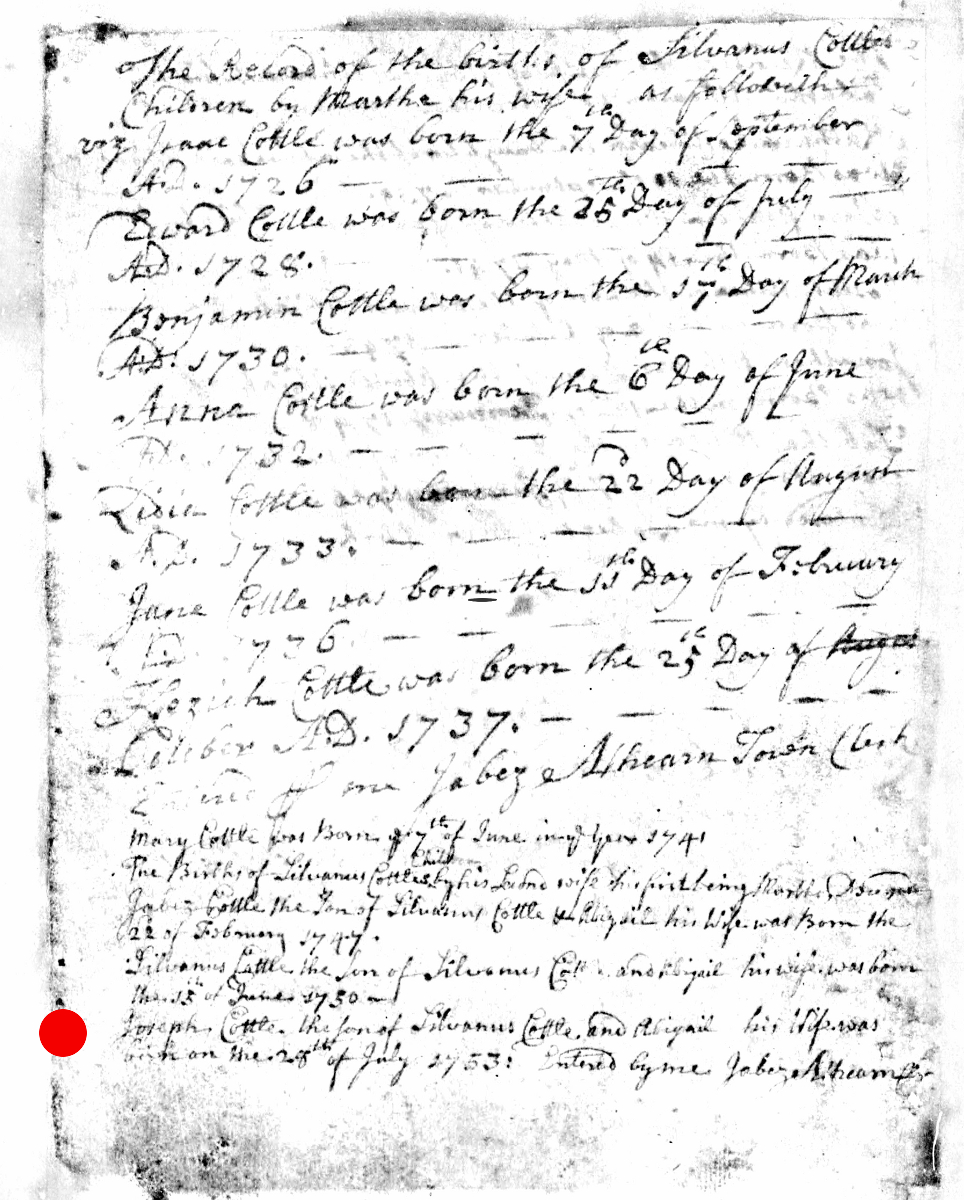 - [S8029] Massachusetts, Births & Christenings, 1639-1915, Birth Record - Jabez Cottle entry, on-line digital copy of original image LDS indexing project (batch) number C50215-1, Family History Library film 0599267, Item 2, (22 February 1747), Church of Latter Day Saints, www.familysearch.org, Salt Lake City,, Utah, U.S.A.