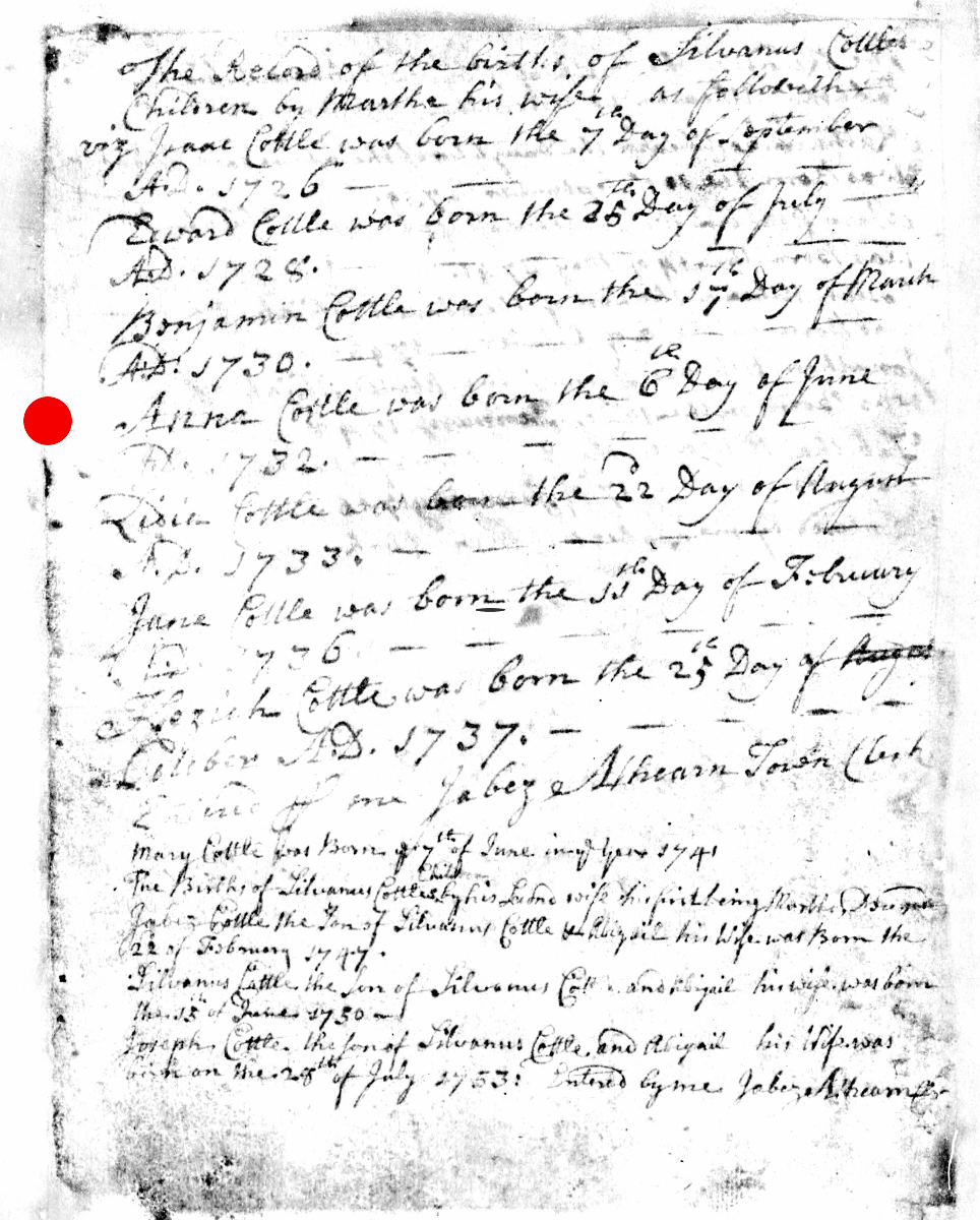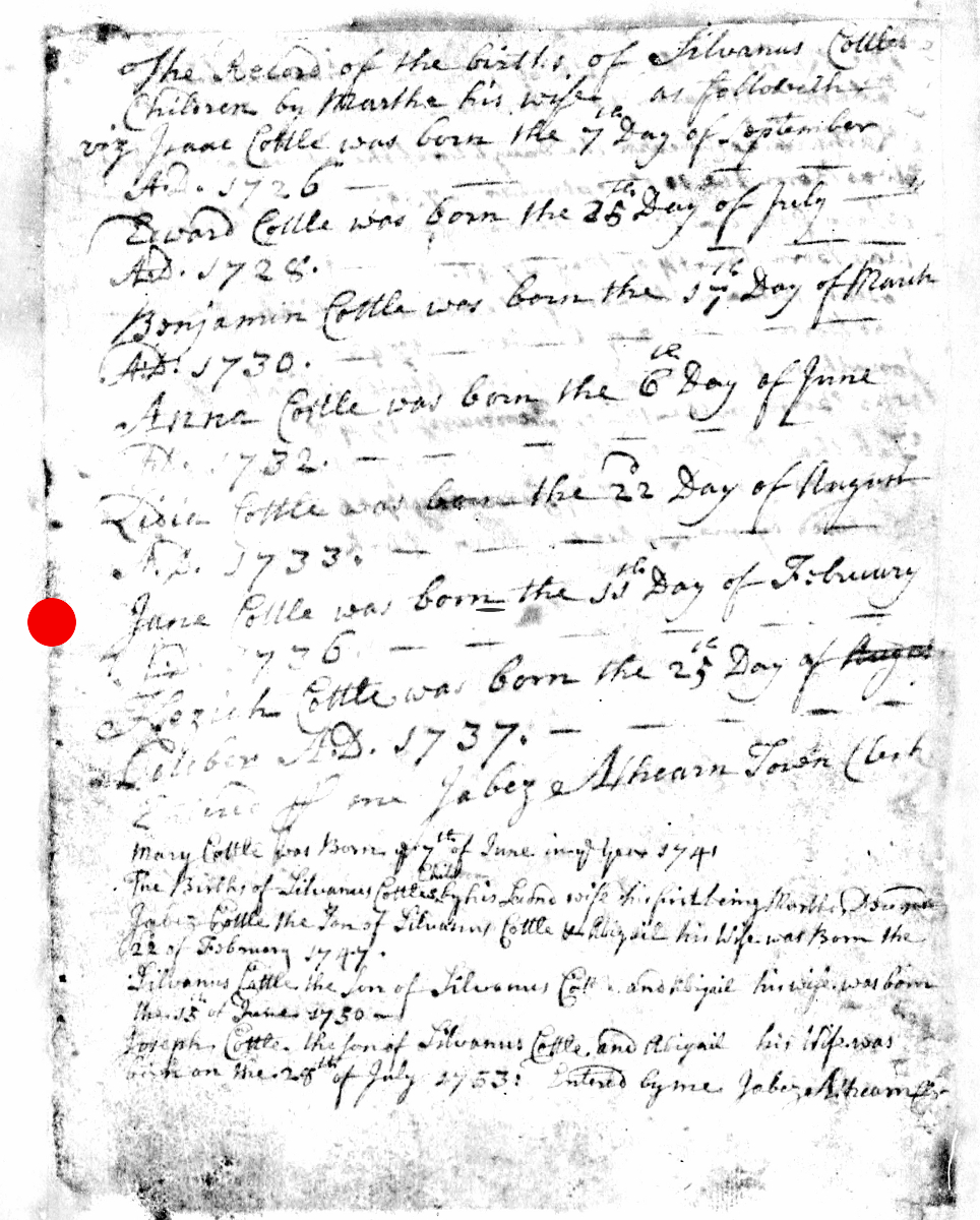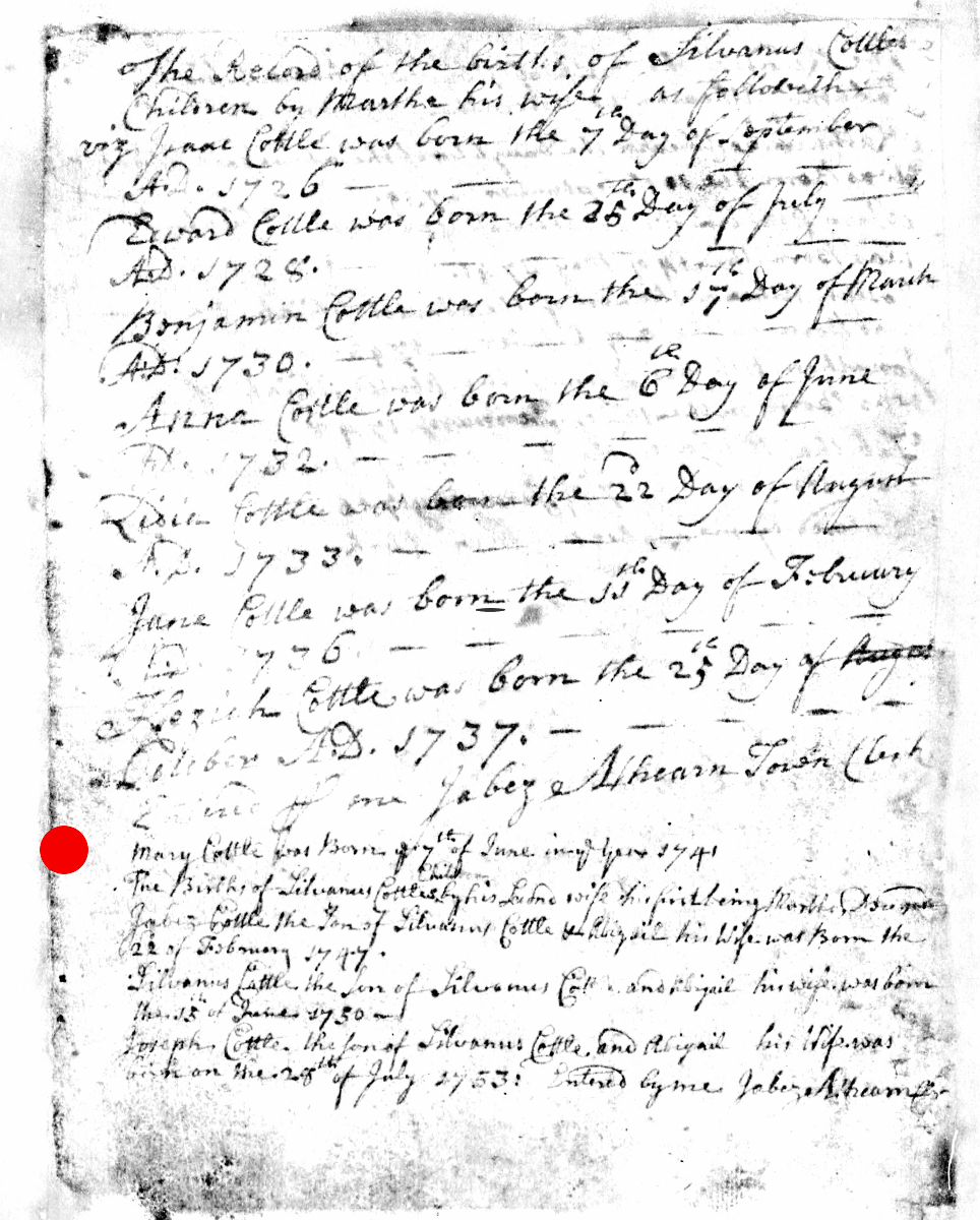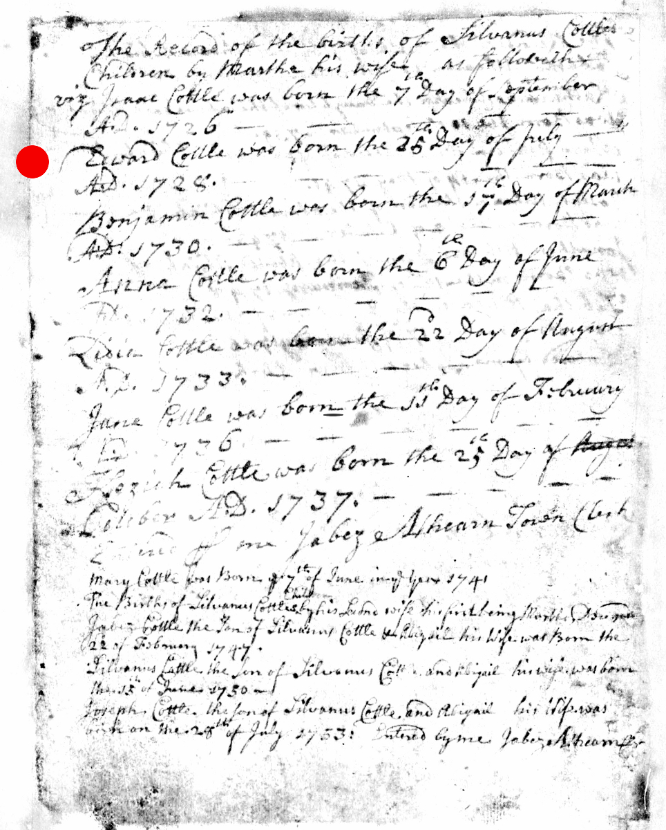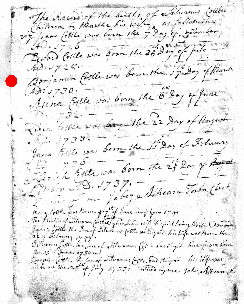 - [S8029] Massachusetts, Births & Christenings, 1639-1915, Birth Record - Jabez Cottle entry, on-line digital copy of original image LDS indexing project (batch) number C50215-1, Family History Library film 0599267, Item 2, (22 February 1747), Church of Latter Day Saints, www.familysearch.org, Salt Lake City,, Utah, U.S.A.